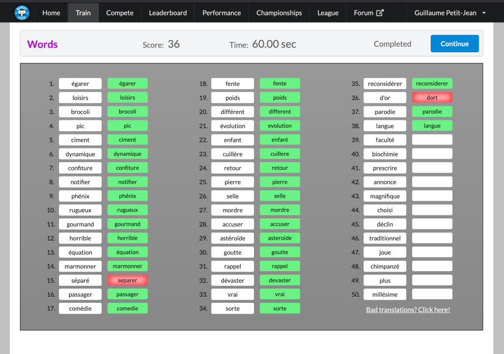 - Le classement sera basé sur le meilleur score cumulé entre l’épreuve de 1 minute et l’épreuve de 5 minutes. (NB: pour l’épreuve des 5mn, tous les mots corrects comptent pour votre score)